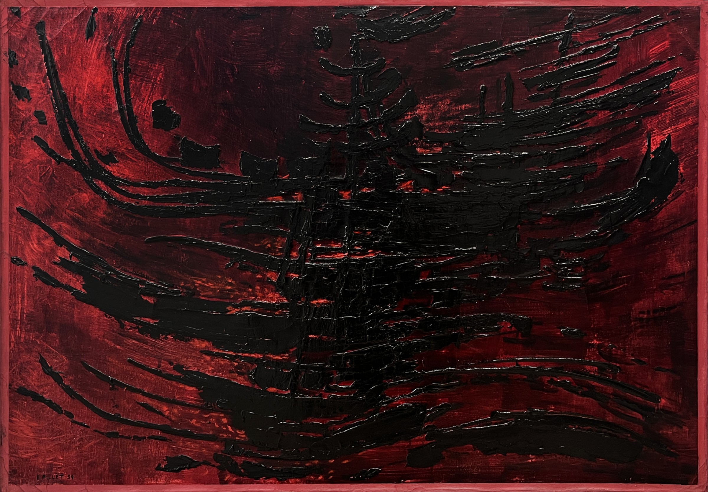 L’esposizione del 1959 alla Galerie Craven di Parigi rivela l’abbandono del gioco geometrico. Lo sfondo è scomparso, lasciando completa libertà a un grafismo sfrenato e ondulato. Nascono composizioni ovali, dalle tonalità scure, caratterizzate da nodi ed anse. Questa nuova animazione della superficie è la conseguenza del desiderio di esplorare un nuovo universo spaziale. Il tema della rotondità trascina Pillet verso i “Creusets” il cui trompe l’oeil della pittura piana si modula su superfici curve, costruite da Pillet con le proprie mani. I Creusets che verso il 1961 assomigliano a maschere, sono rimpiazzati nel 1963-64 da un gioco di forme concave e convesse. Attraverso l’invenzione di questa nuova tecnica si può considerare Pillet come “pittore-scultore”. Negli anni seguenti l’artista ha perseguito l’esercizio di tre discipline: pittura, scultura e architettura in una sintesi rivelatrice del suo desiderio di un’arte totale.